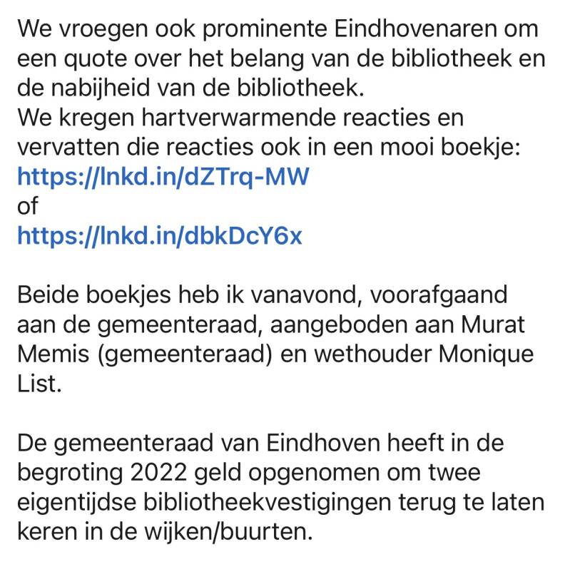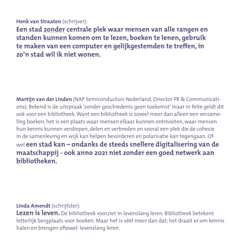 Albert Kivits, directeur van Bibliotheek Eindhoven, vroeg aan (o.a.) mij om als "prominente" Eindhovenaar een quote te schrijven voor een boekje dat het belang van de bieb benadrukt. Zie mij staan samen met Henk en Martijn (nee, niet op de foto, maar in tekst...).