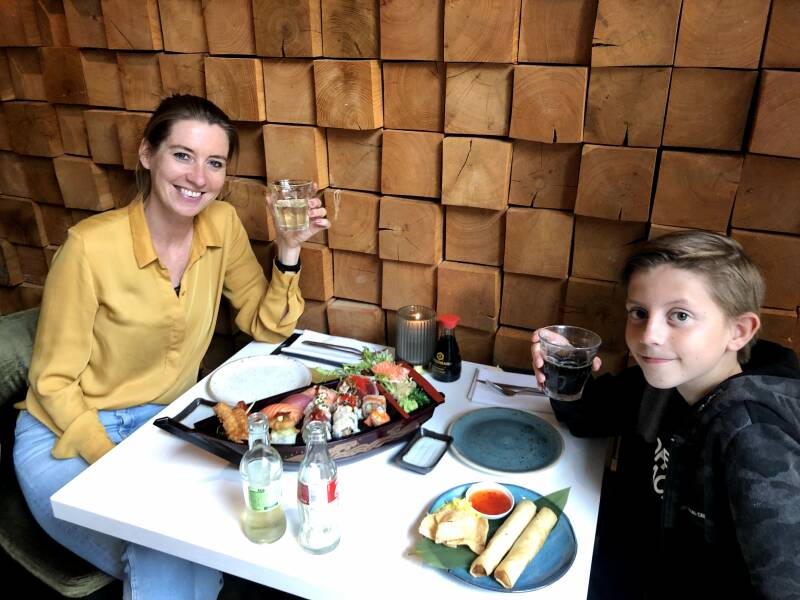 Ella’s broertje en moeder (die twee van de foto) wilden dolgraag zien waar ze -sinds kort- werkte. Haar eerste baantje, als bedienend personeelslid, bij een Frans-Aziatisch restaurant! Die eerste taal spreekt ze, de andere is wat lastiger.