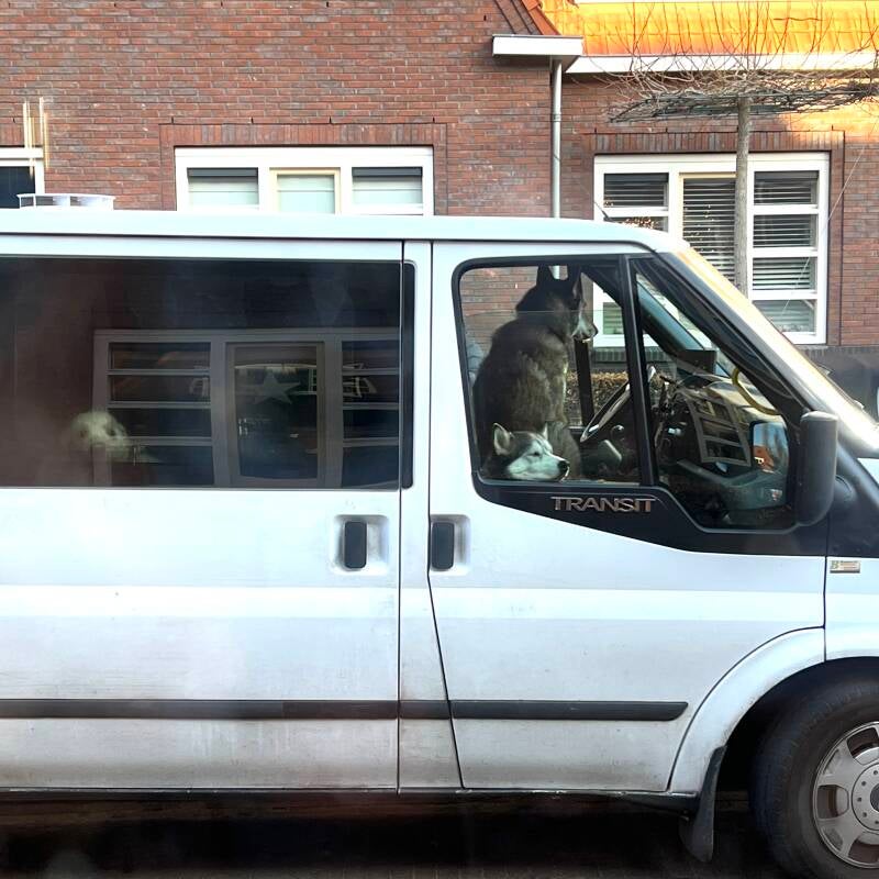 Dit busje parkeerde bij mij voor de deur en stond daar enkele minuten. Ik liep naar buiten en vroeg de bestuurder waar hij moest zijn. Hij keek me lodderig aan. Als antwoord likte hij het raam. De bijrijder tilde zijn kop even op. Daarna legde hij die weer te ruste op de rand van de deur. Vanaf de achterbank klonk een blije blaf. Ik werd niet veel wijzer van deze ontmoeting. Wel blijer. Ik tilde mijn hand op ter begroeting en liep weer mijn huis binnen. Ik keek het busje na toen het wegreed.